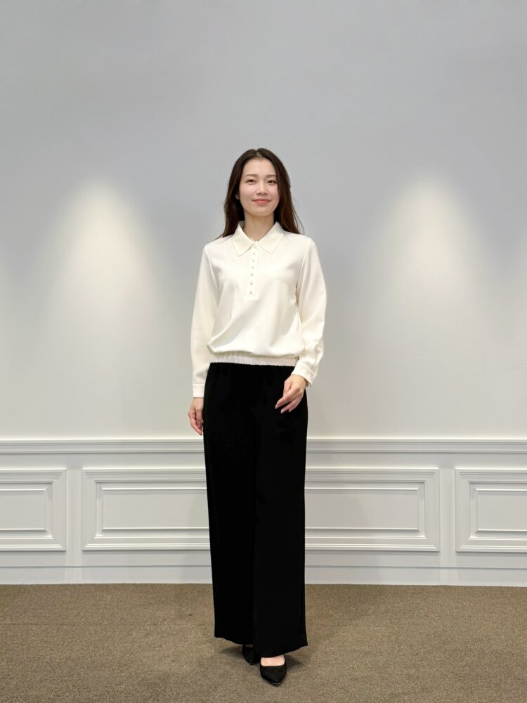 クリーンなホワイトと引き締め役のブラックを軸に、無駄を削ぎ落とした配色が大人の品格を際立たせる装いです。トップスの立体的な表情と、パンツの美しい落ち感がバランスよく調和し、自然と縦のラインを強調。足元には黒のヒールパンプスを合わせることで、全体に凛とした緊張感を添えています。オンシーンからきちんと感を求められるお出かけまで対応できるスタイリングです。