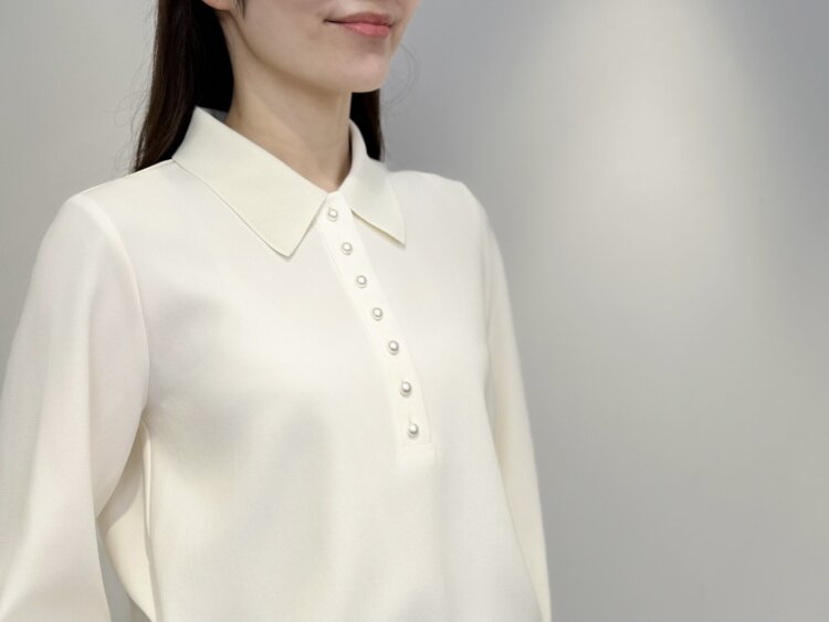 <ダブルクロスポロブラウス>は、上質なダブルクロス素材ならではの適度なハリと滑らかさが魅力の一枚。身体のラインを拾いすぎないコンパクトなシルエットで、着るだけで知的で整った印象を演出します。ポロ襟のデザインが程よいきちんと感を生み、ジャケットを羽織らずとも上品にまとまるのが特徴です。