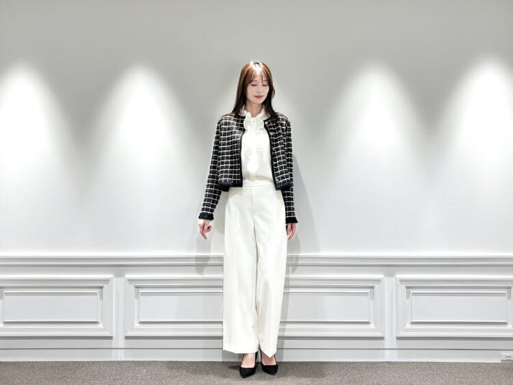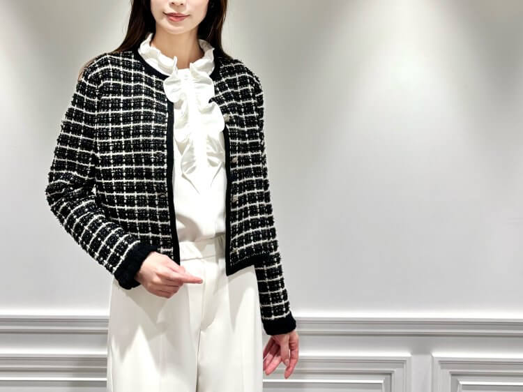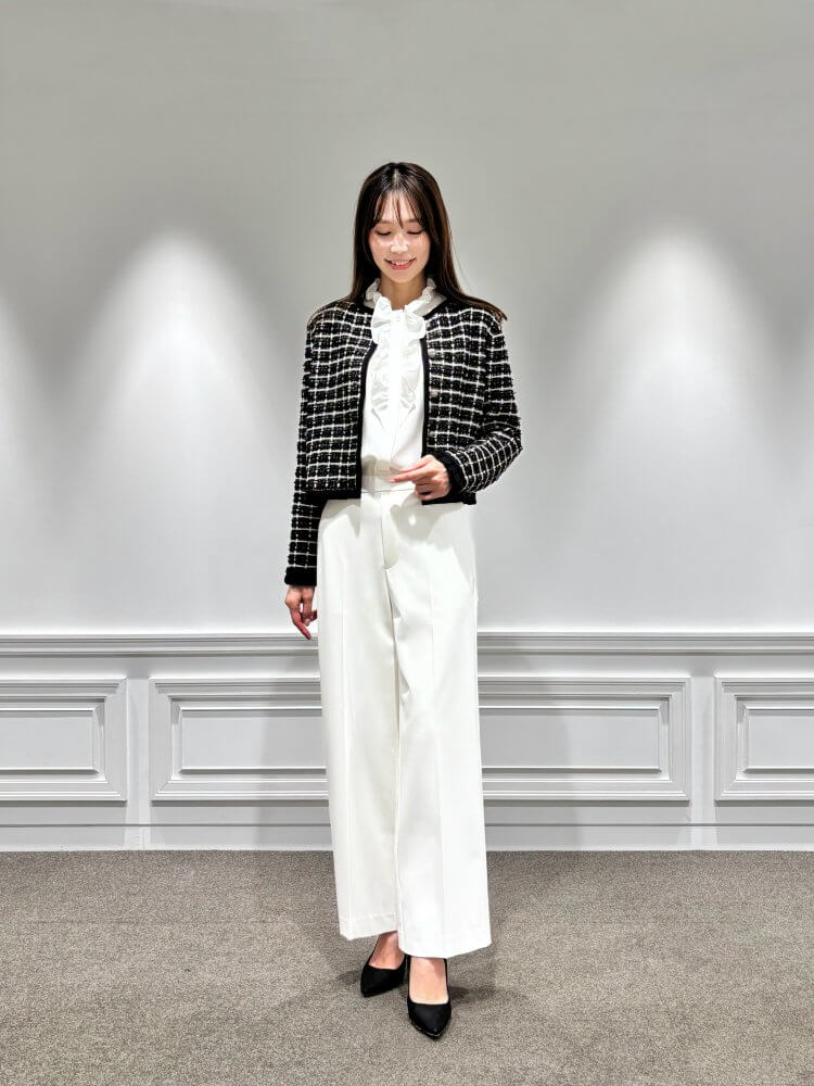 インナーには、アクセサリーなしでも華やかな存在感を放つフリルブラウスを合わせて、特別感のある装いに仕上げます。