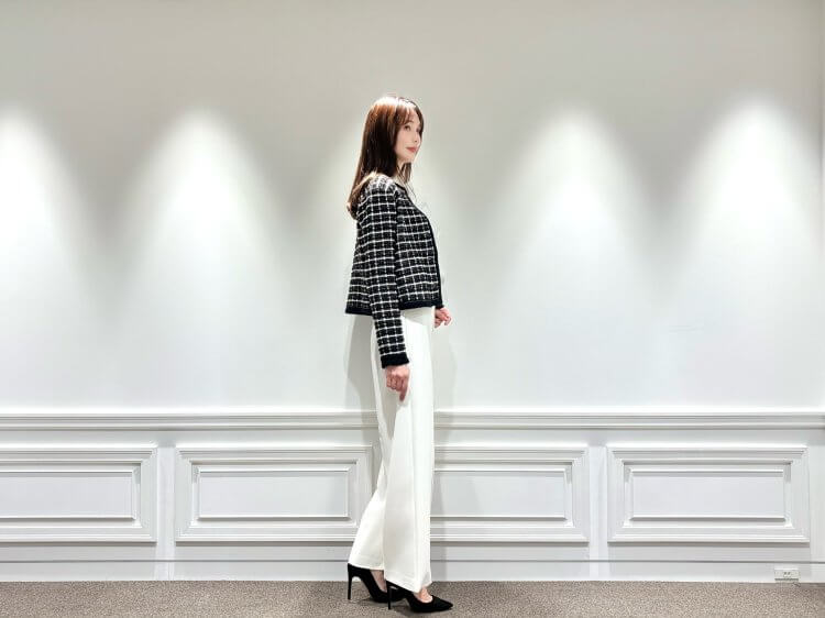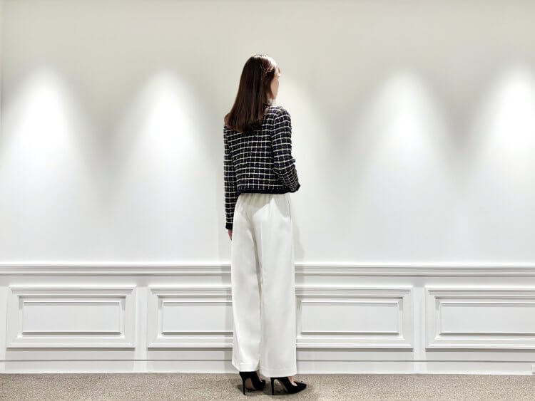 ボトムスには白のワイドパンツを選び、軽やかさと抜け感をプラス。
