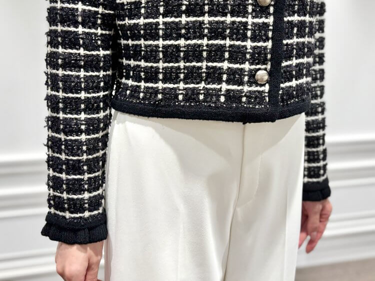 温かみのある素材感ながら、ツイードジャケットのような上質さを備えており、きちんと見せたい日にぴったり。