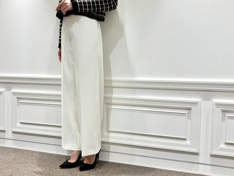 ほどよいハリのある素材と落ち感でお仕事シーンからお出掛けまで大人の洗練されたパンツスタイルが叶います。