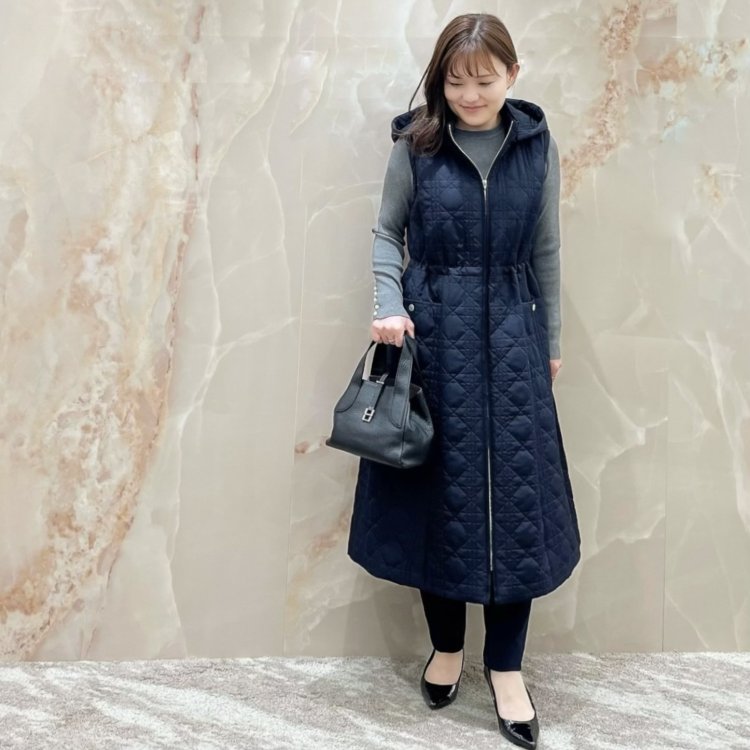 スカートはニットジョーゼットミディスカートを合わせました!自然なフレアラインが大人の上品な印象を与えてくれます。ウエストベルトが施されているのでトップスインで上下にもメリハリを出しました。ニットのシアースリーブが程良く軽さを出してくれるので、オールブラックコーデでも重くなり過ぎずお召しいただけます!