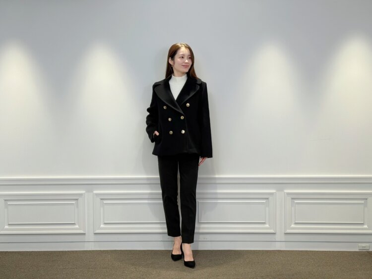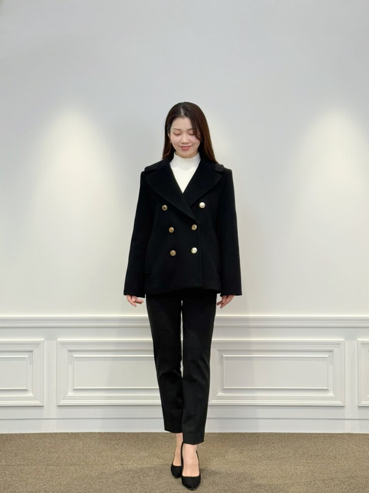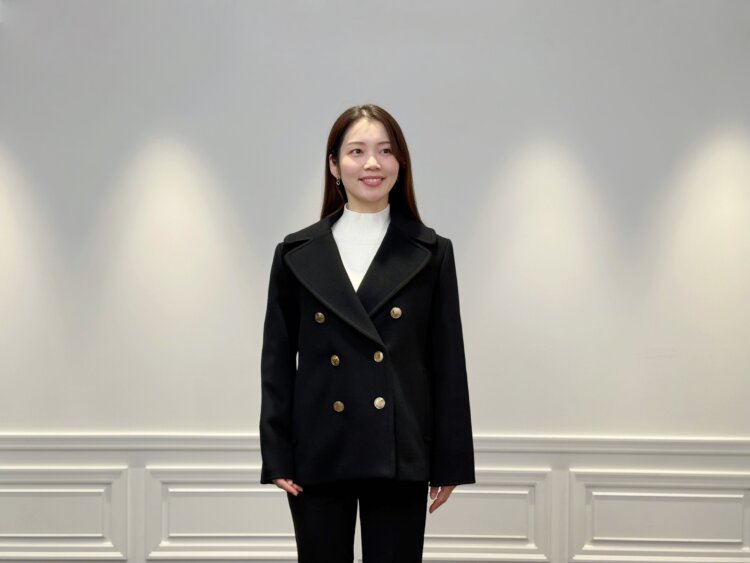<ラムリバーPコート>は、上質なラム素材を使用した柔らかな着心地が魅力。立体的なシルエットが体を包み込み、軽やかさを保ちながらも冬の装いに品格を添えます。きちんと感のあるPコートデザインが、日常からお出かけまで幅広く寄り添う一枚です。