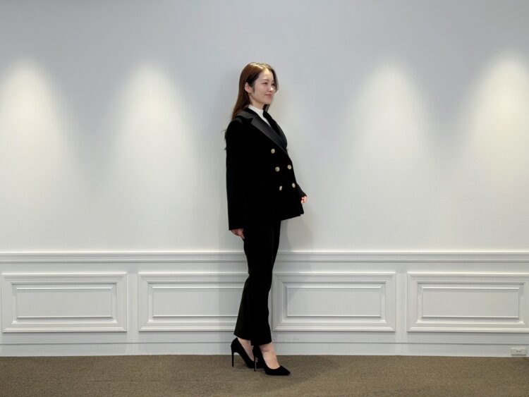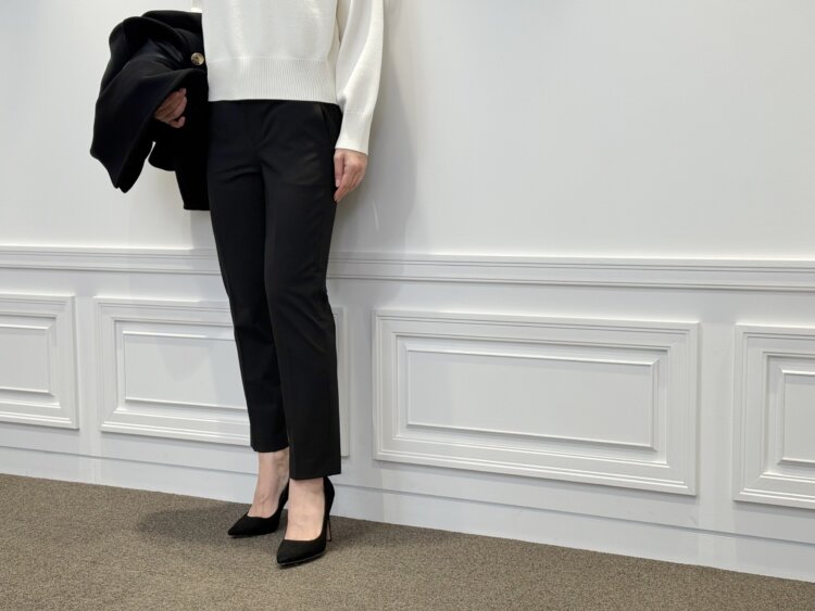 ボトムは<ストレッチテーパードパンツ>を選び、脚のラインをすっきり見せる洗練されたシルエットに。ストレスフリーな着心地ながらフォルムは端正で、ジャケットやアウターとの相性も抜群。黒パンプスを合わせることで、足元まで統一感のある美しい縦ラインがさらに強調されます。