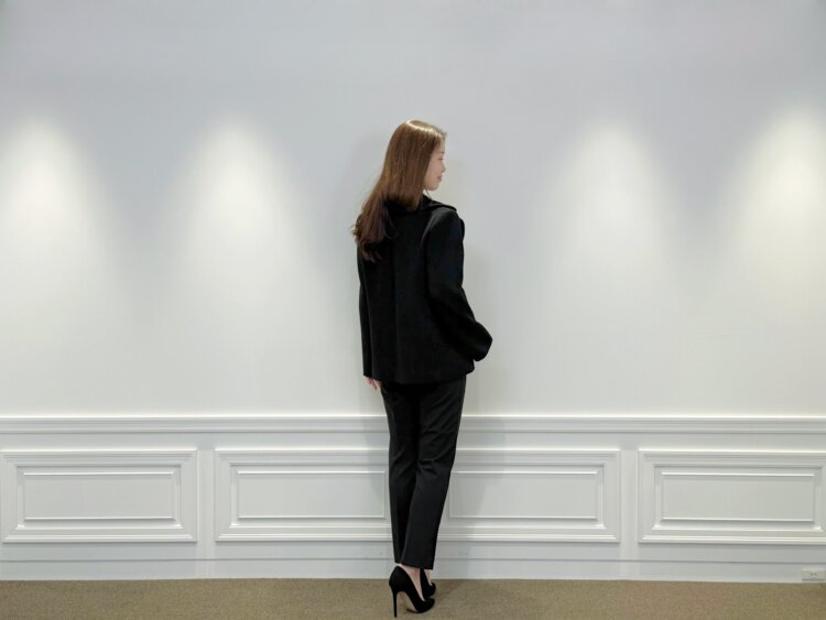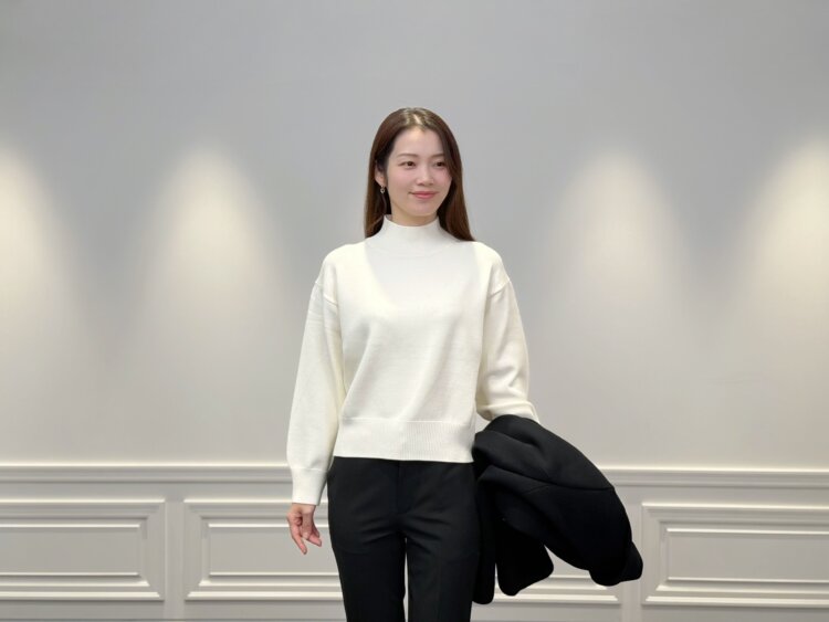 インナーには<ハイネックニットプルオーバー>を合わせ、顔まわりを明るくクリーンに引き立てています。繊細な編み地と柔らかな風合いが、ブラックアウターとのコントラストを上品に昇華し、シンプルながらも存在感のあるレイヤードが完成します。