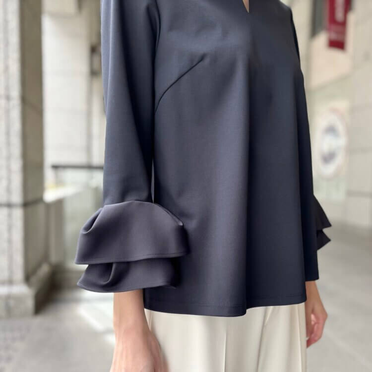 ラウンドネックと程よくボディに沿うウエストラインが抜群のキレイ見え!ですが、きちんとしてても重たく見えないのは生地の軽やかさと足元の透け感のおかげ。さらにこの透け感は羽織りのシアー素材との統一感も演出し、まとまりある装いへと導いてくれます。