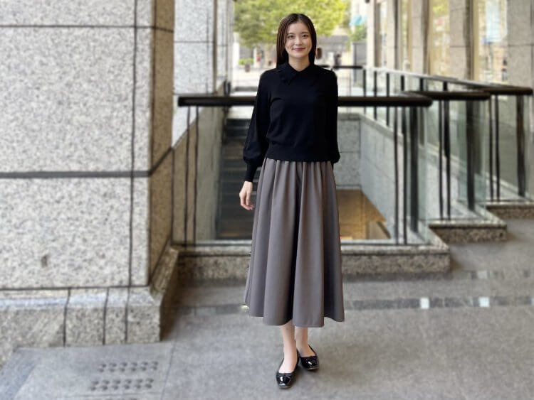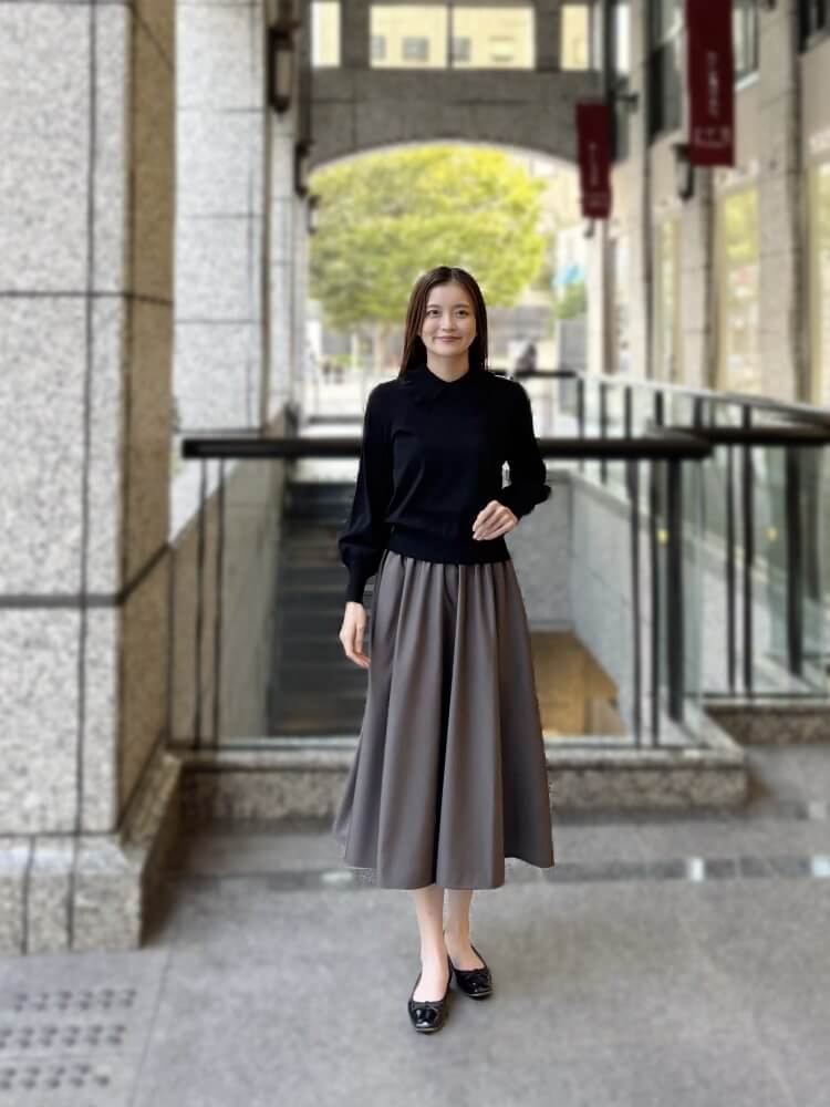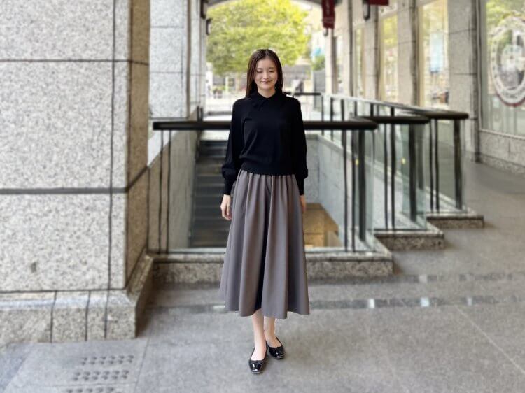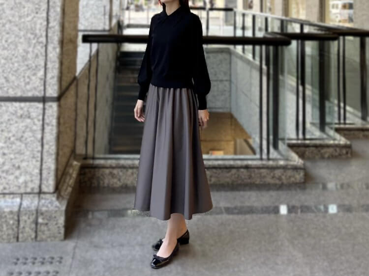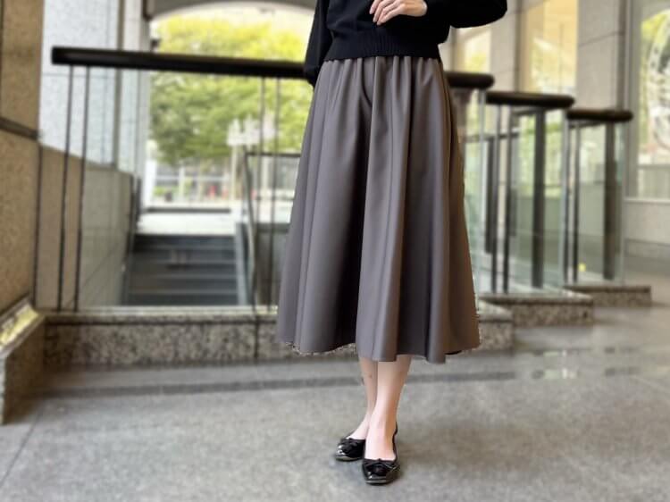 今回は、光沢感と落ち感のあるギャザーフレアスカートを合わせて、動きのあるエレガントなスタイルに。