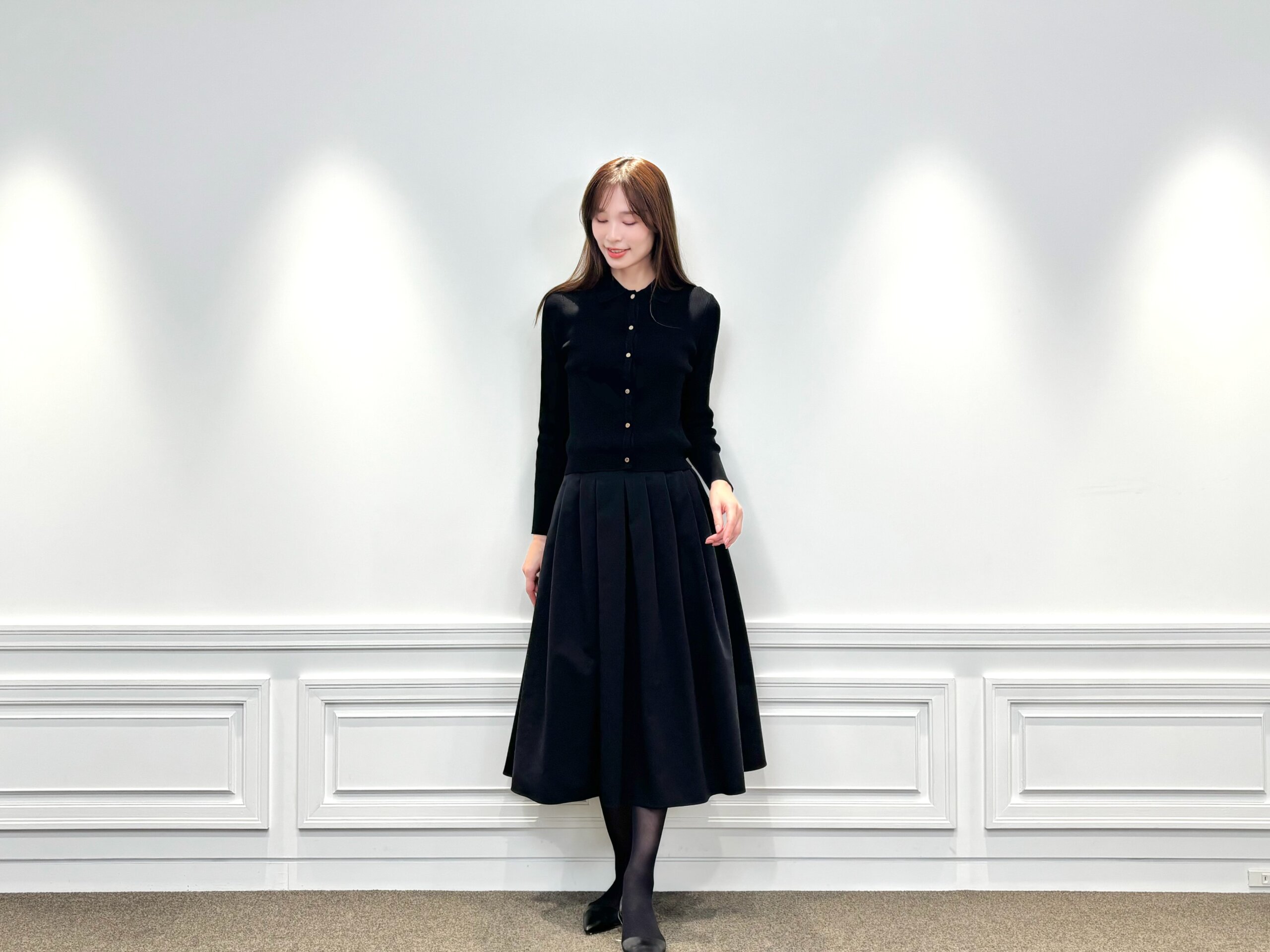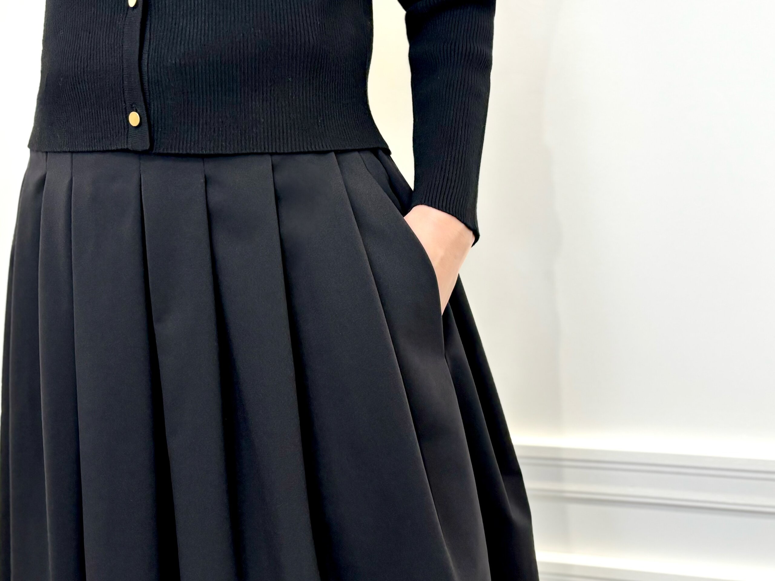 ほどよくフィットするシルエットが女性らしいラインを引き立て、上品な抜け感を演出します。ふんわりと広がるミディ丈のスカートを合わせることで、全身ブラックでも重くならず、エレガントな立体感のある着こなしに。