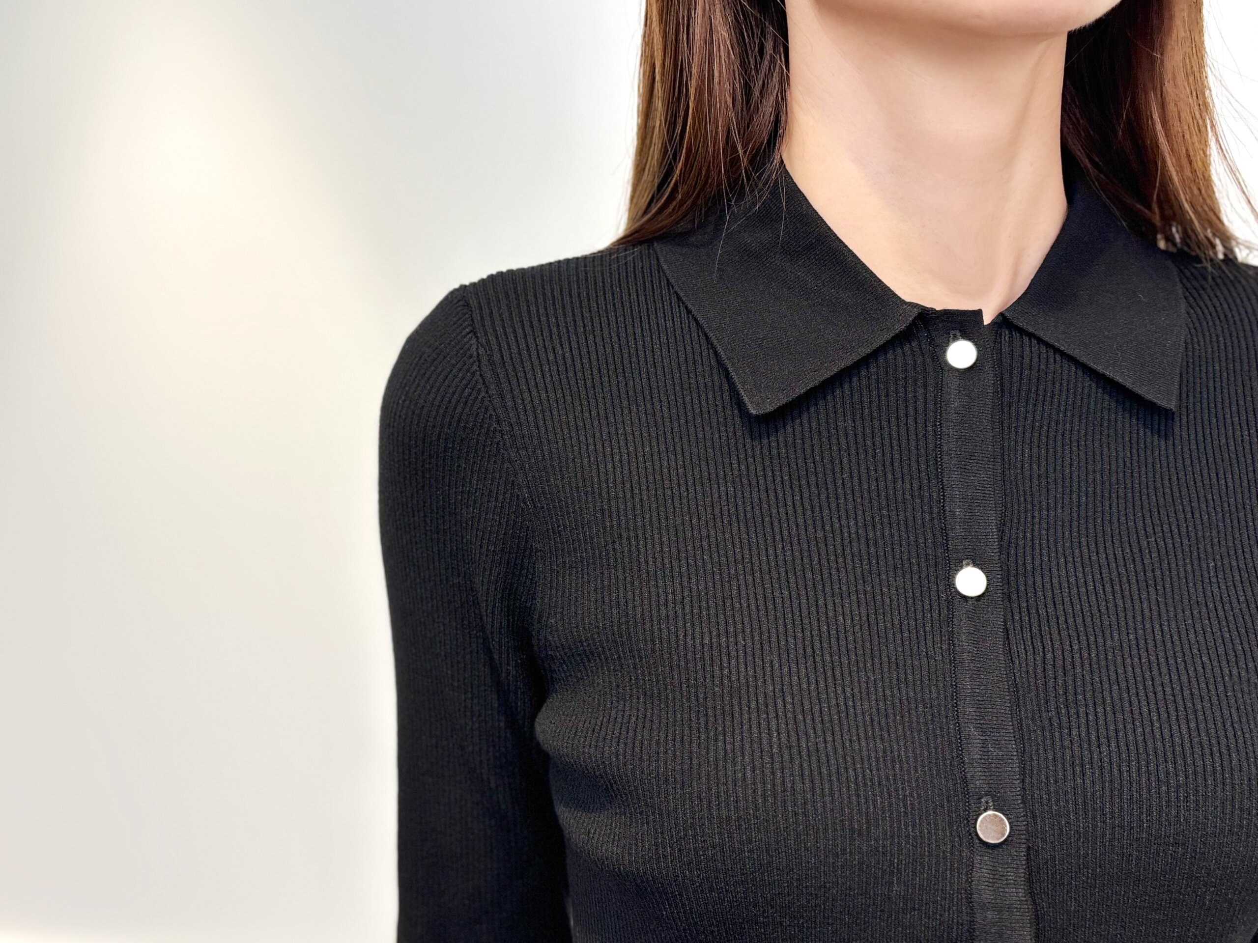 襟付きリブニットでつくる、品よく今っぽいオールブラックコーデ