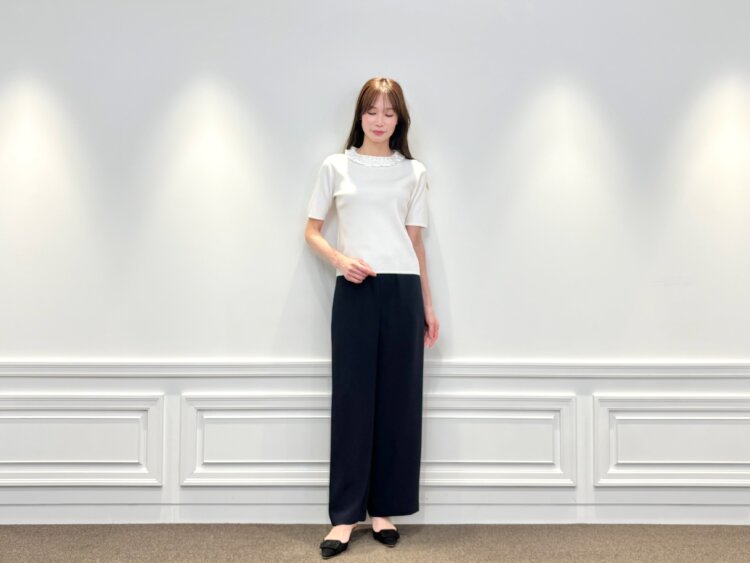 襟元フリルで品よく映える、綺麗めパンツコーデ