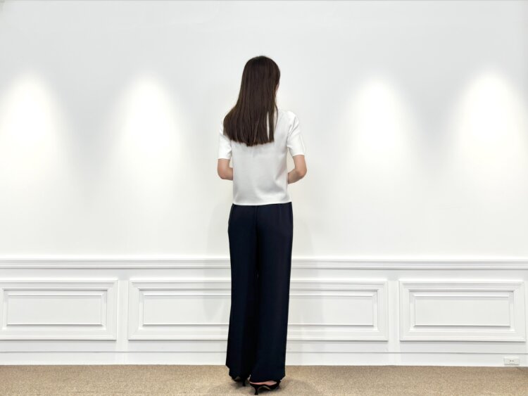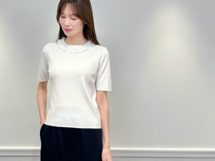 トップスは、襟ぐりに施されたギャザーフリルがさりげない華やかさを添えてくれる一枚。甘くなりすぎない控えめなフリルデザインで、顔まわりをやわらかく、女性らしい印象に見せてくれます。シンプルなシルエットだからこそ、ディテールの美しさが引き立ち、アクセサリーいらずでも品よくまとまります。