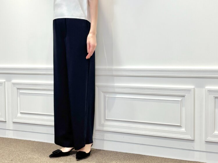 ボトムには、ネイビーのワイドパンツを合わせて落ち着きのあるバランスに。広がりすぎないストンとしたラインが縦のシルエットを強調し、すっきりとスタイルアップ効果も◎。きちんと感がありながら、動きやすさも兼ね備えているので、デイリーにもお仕事にも活躍してくれます。