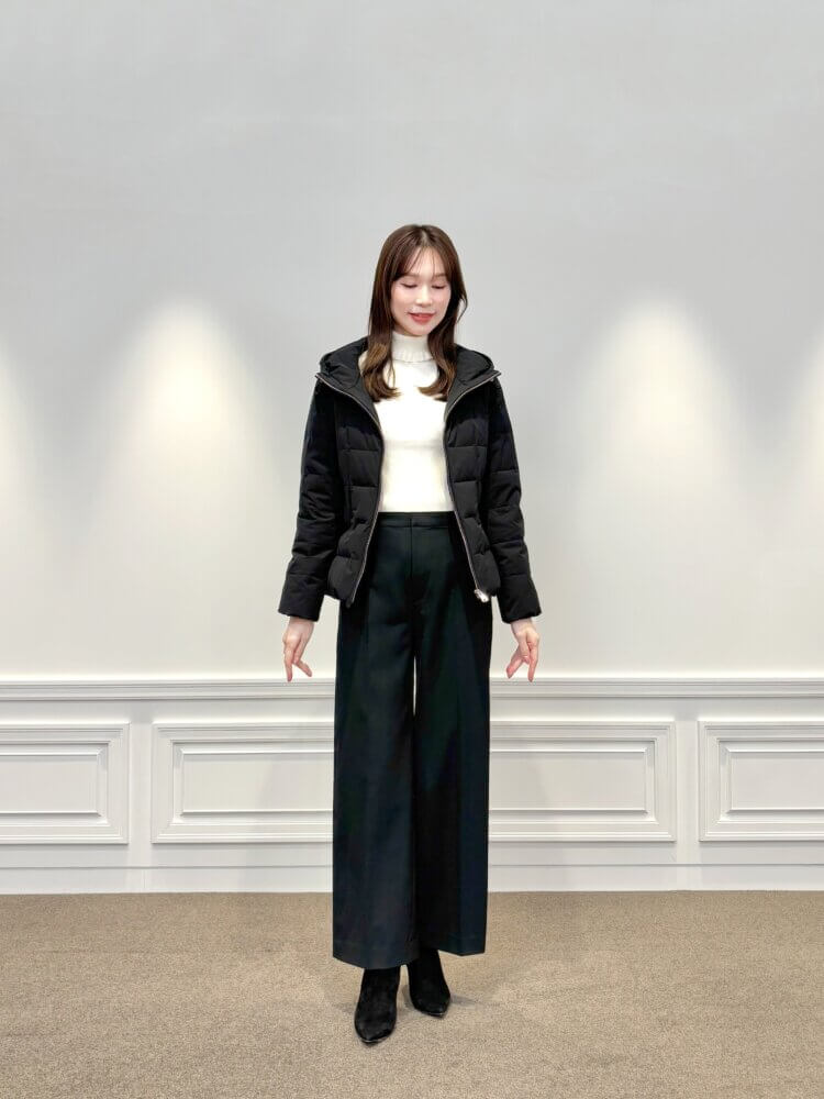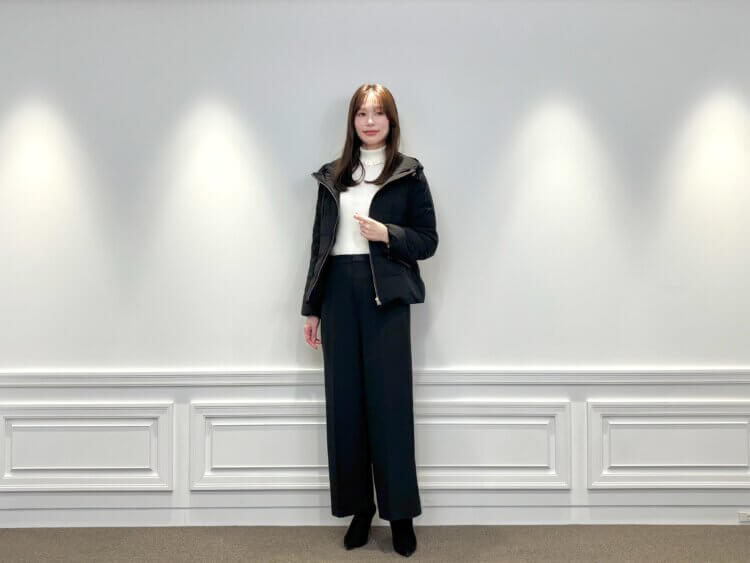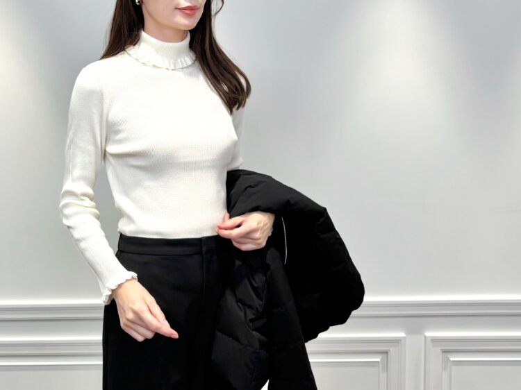 インナーには、さりげないフリルが華やかに見せてくれるのホワイトのニットをセレクト。やわらかい色味がコーデ全体に明るさを添え、黒アウターとのコントラストで女性らしさがぐっと引き立ちます。