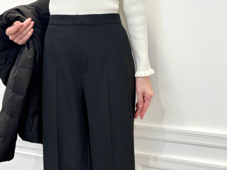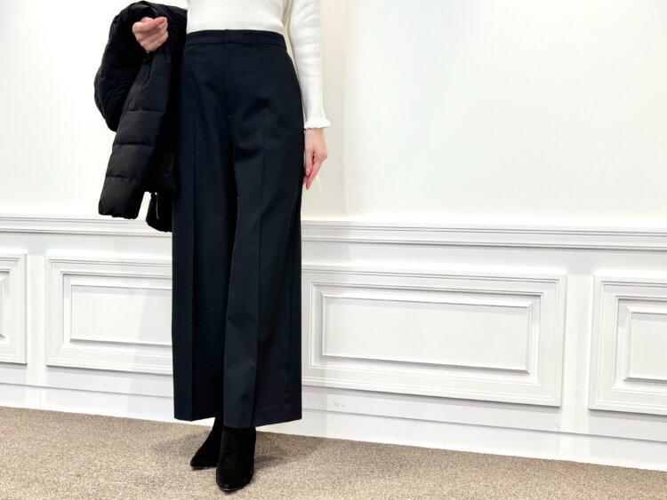 ボトムは、美しいラインが魅力のワイドパンツをあわせ、上品さとスタイルアップを同時に叶えます。