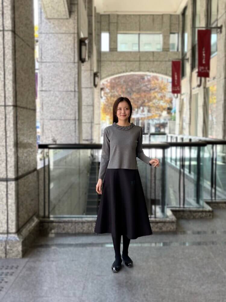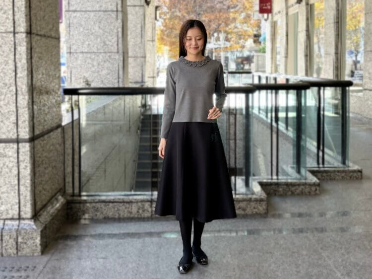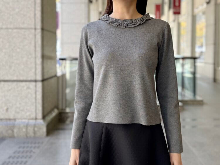 首元フリルが主役。洗練グレーでつくる冬のエレガンス