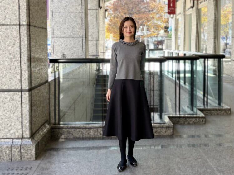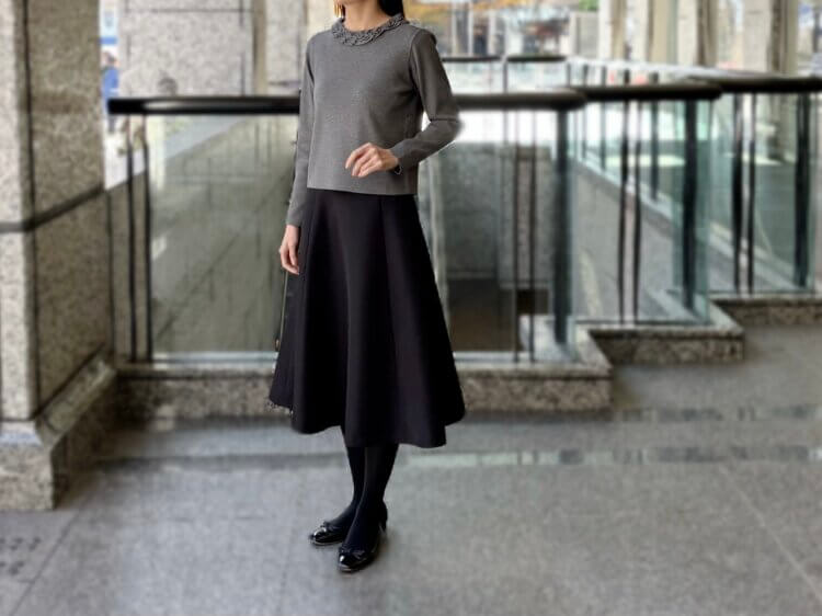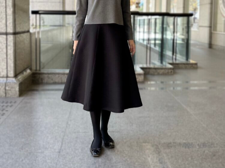 オンの日には、ニットの上品さとスカートの奥行きが相まって、自然ときちんと感のある印象に。