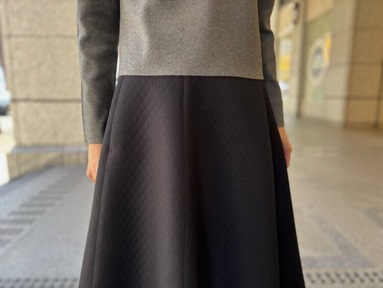 合わせたフレアスカートは、ふんわりと広がるシルエットが歩くたびに優雅に揺れキルティングジャガードの凹凸が立体的な陰影をつくる一枚。