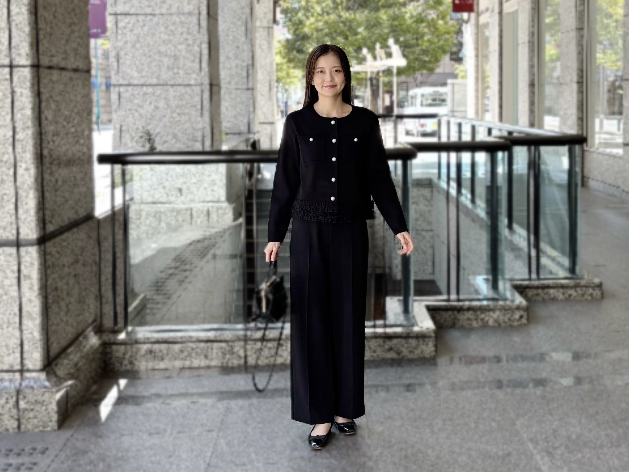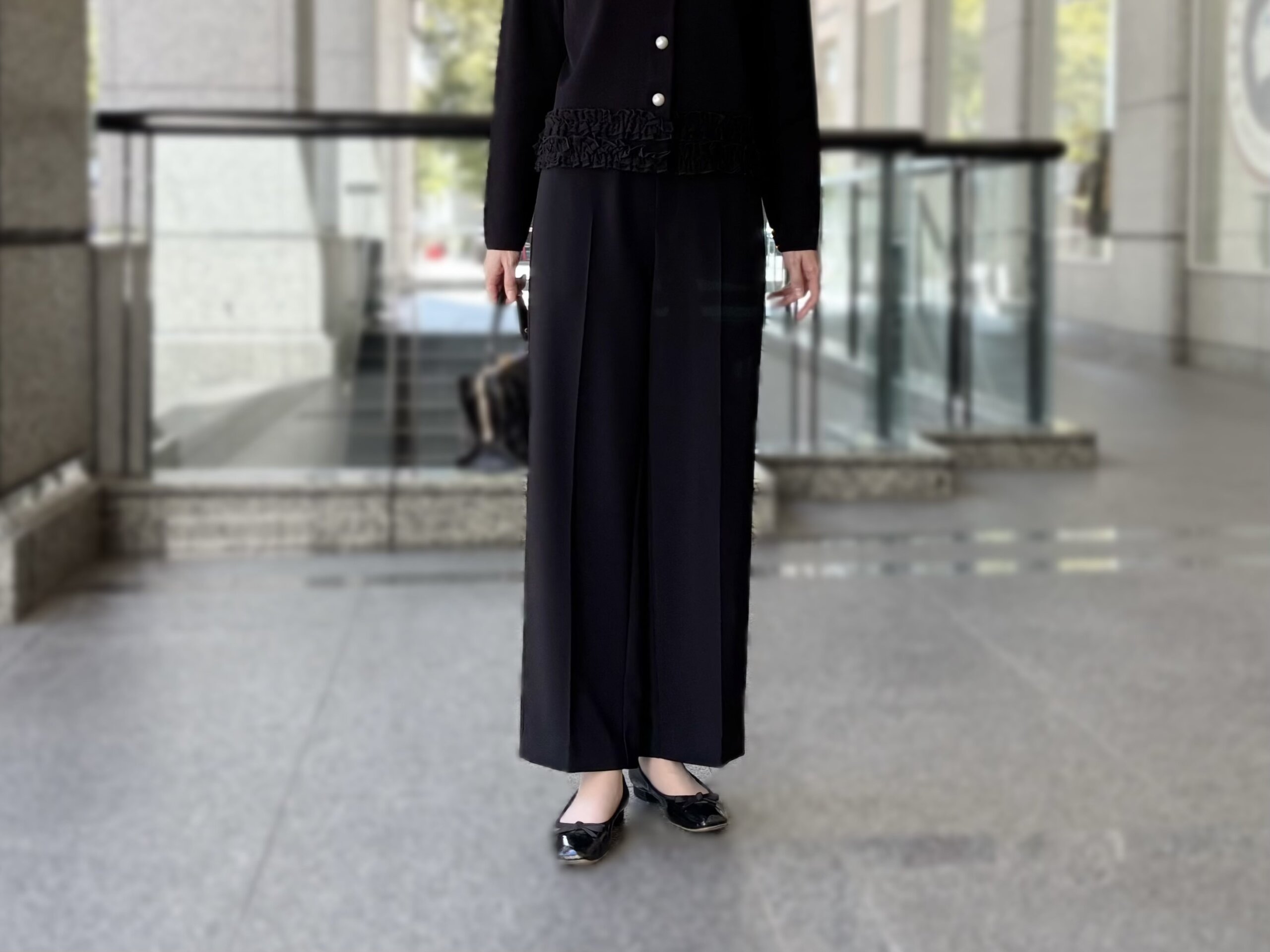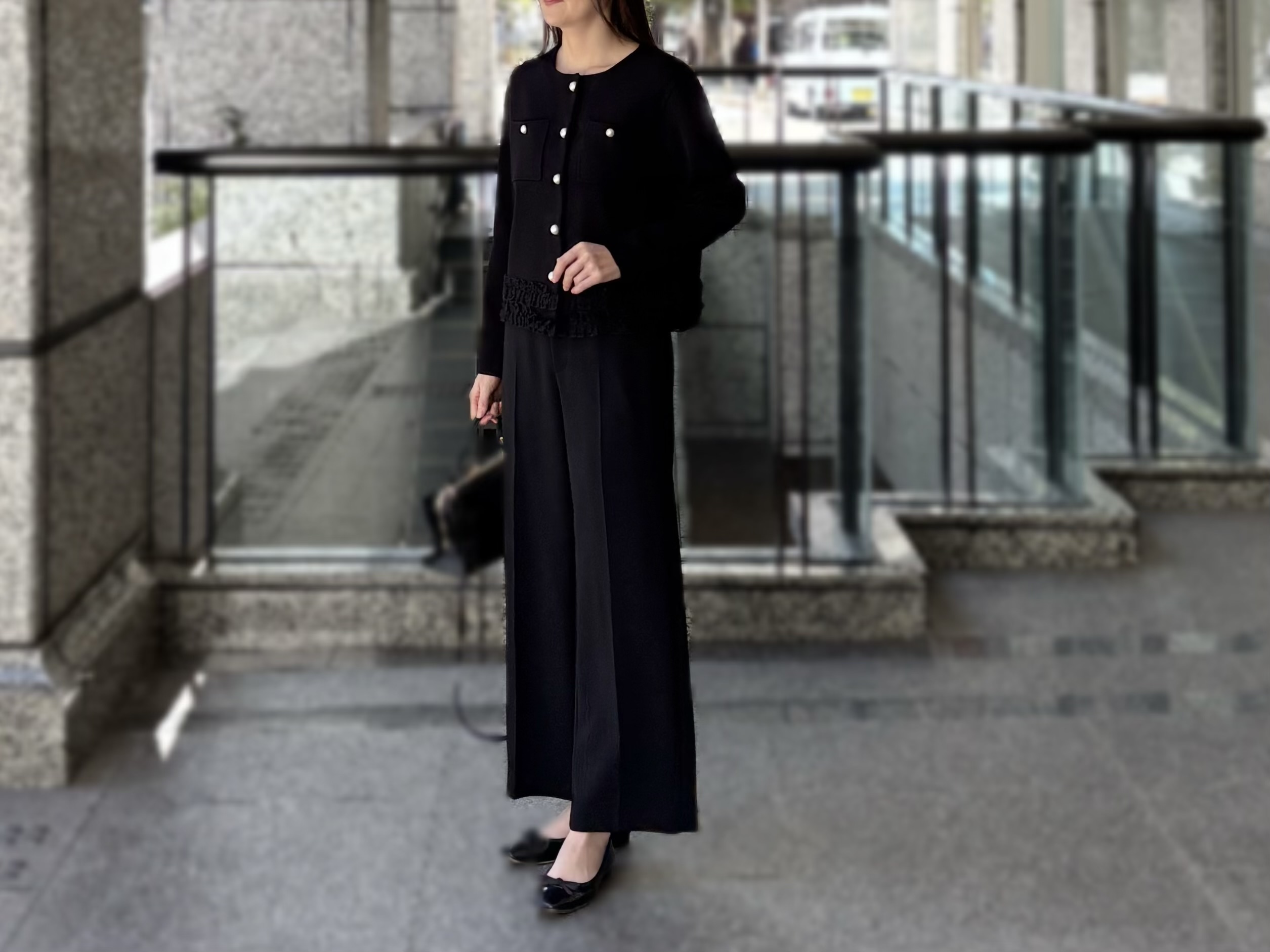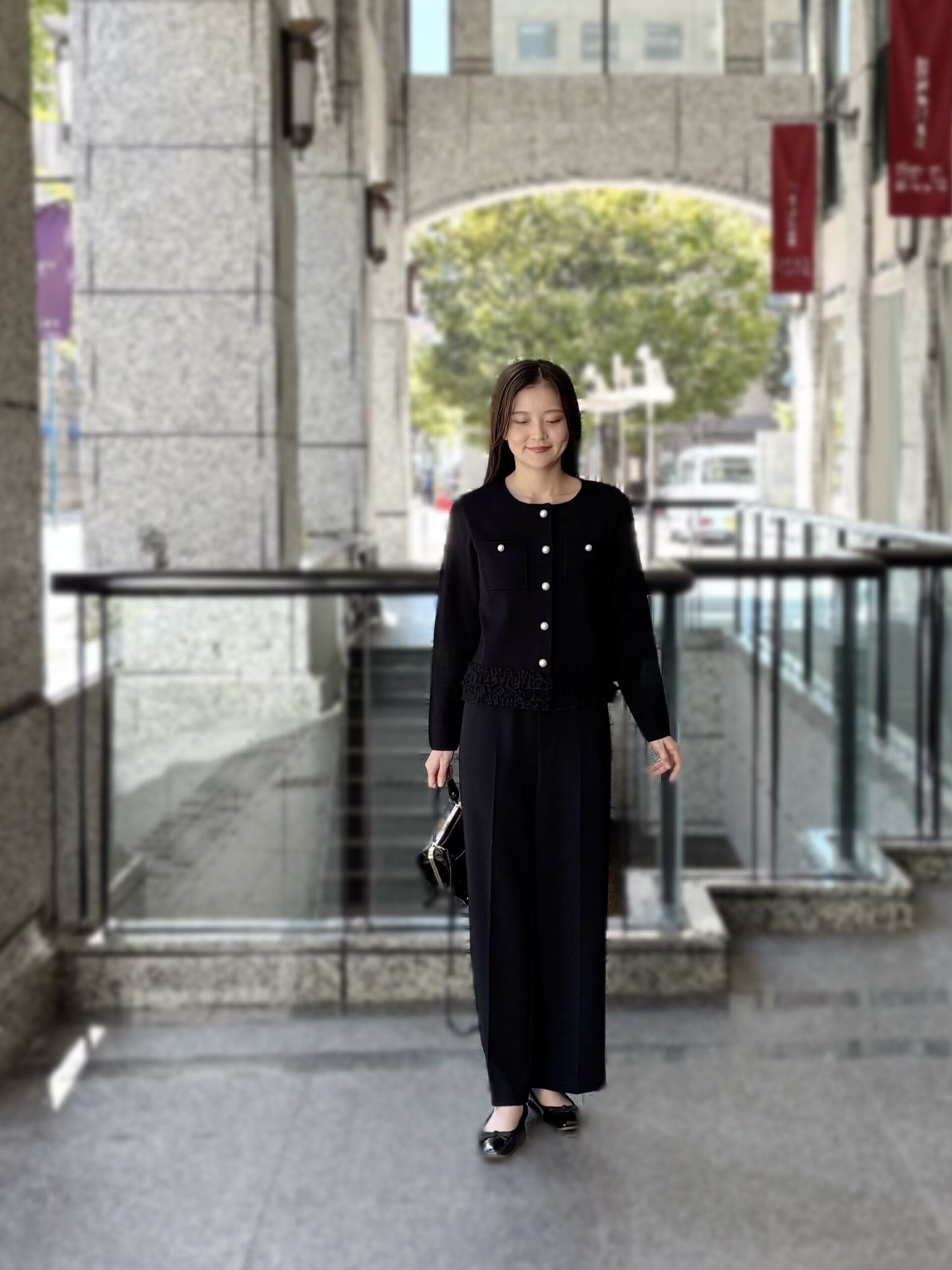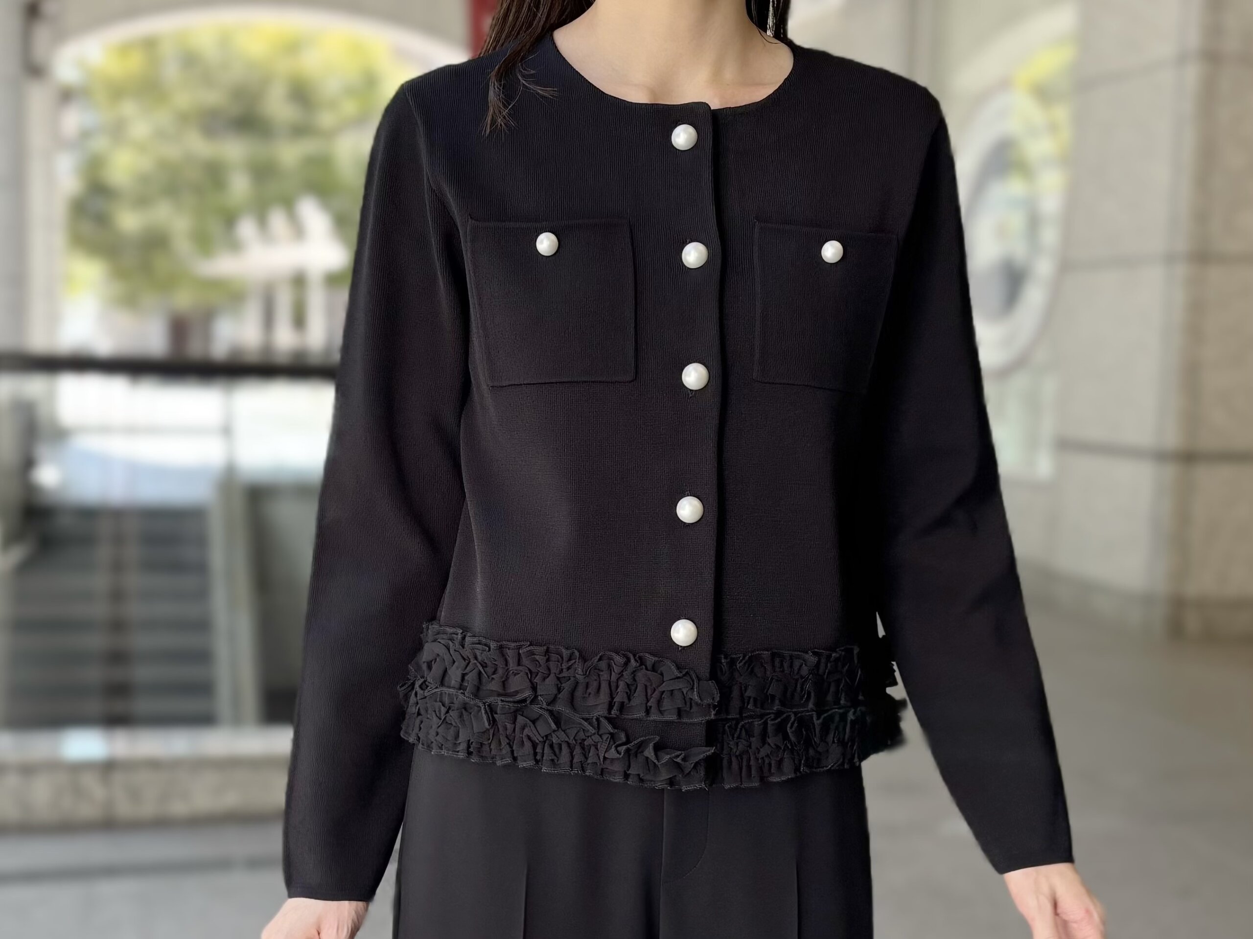 フロントのパールボタンがクラシカルな華やぎを添えるパールボタンフリルニットジャケットに、シルエットの美しさが際立つワイドパンツを合わせて全身をシックなブラックで統一。