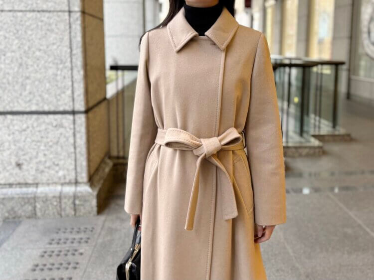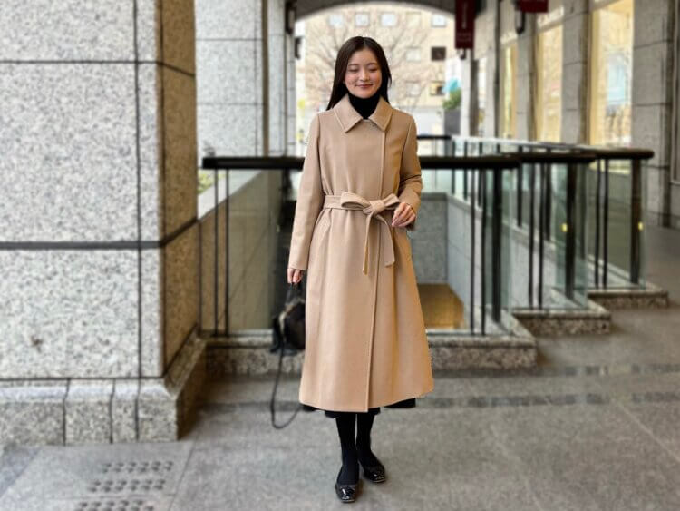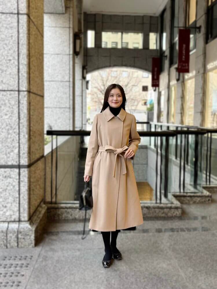 ブラックのインナーを合わせることで、ベージュカラーの柔らかさが引き立ち、落ち着きのある冬の装いに仕上がります。
