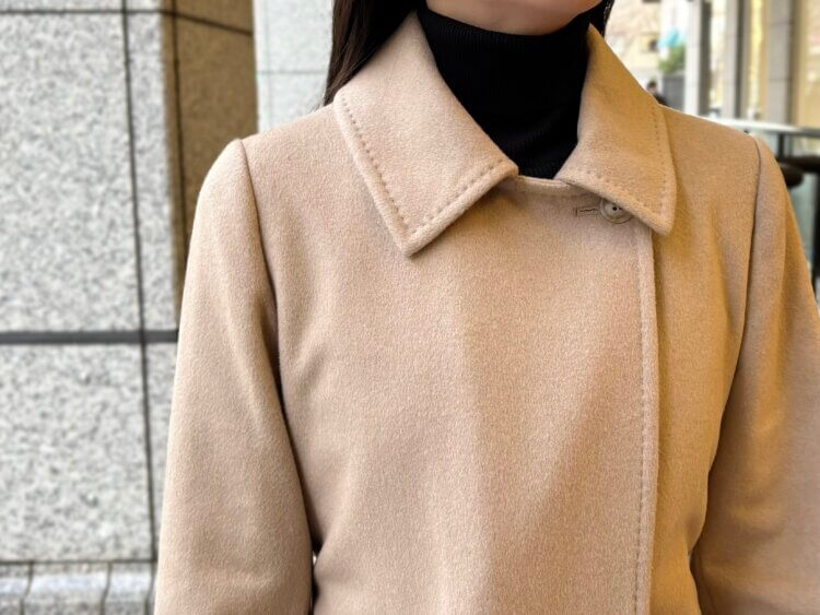 カシミヤ混ならではのなめらかなタッチと上品な艶が、曇り空の下でも装いを明るく見せてくれます。