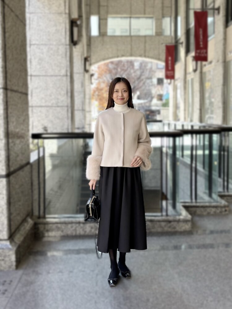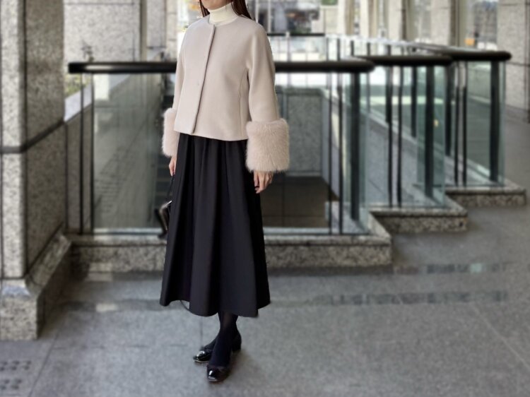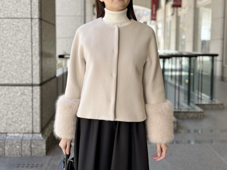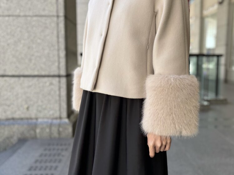 淡いカラーとノーカラーのすっきりとしたデザインが冬の景色にやさしく馴染み、袖口のフェイクファーがさりげない華やぎを添えてくれます。