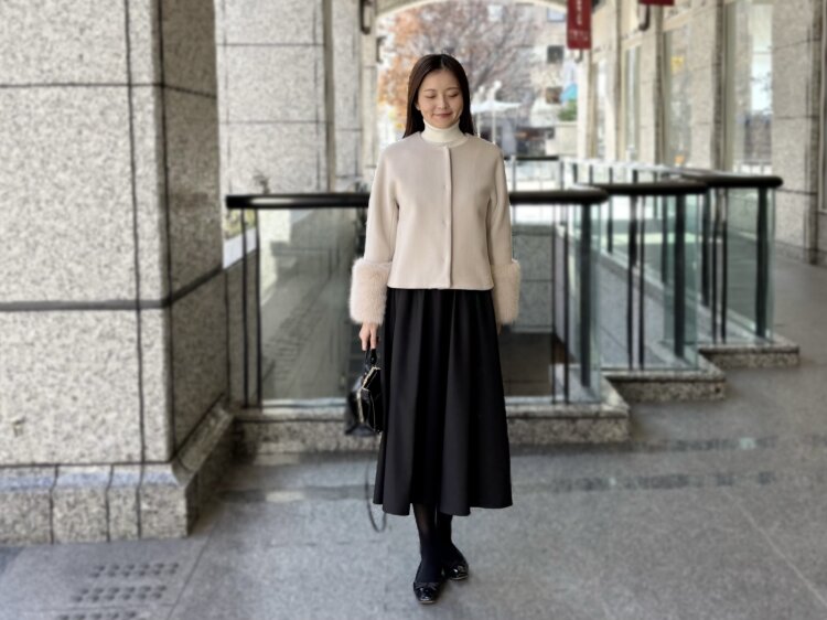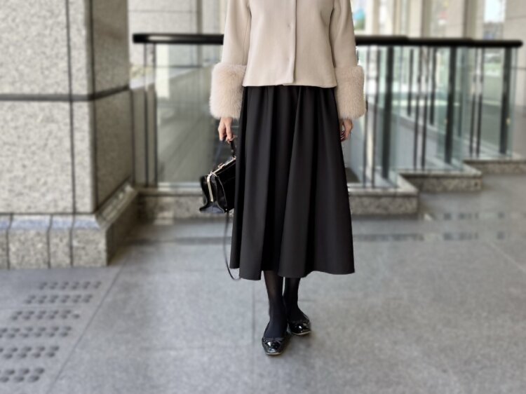 足元はブラックで引き締め、冬らしいきちんと感をプラス。