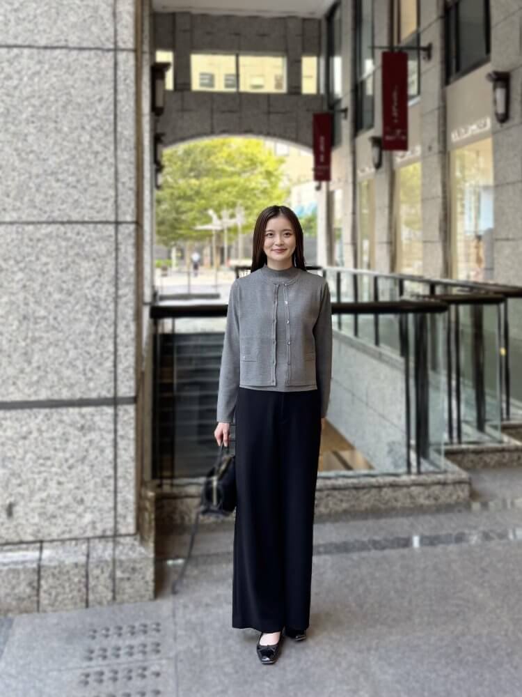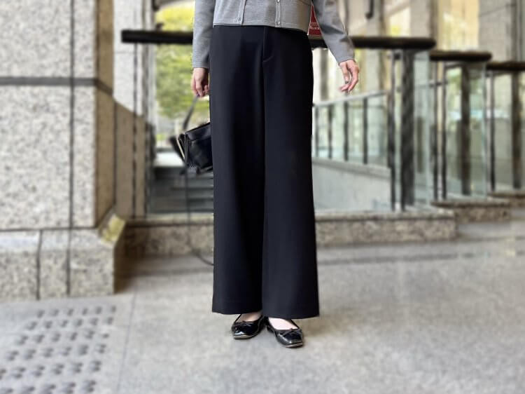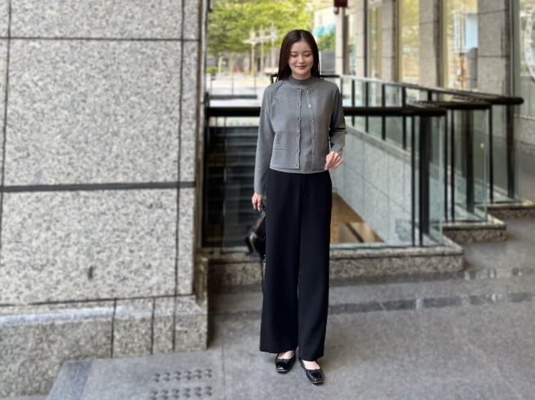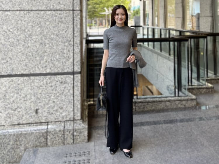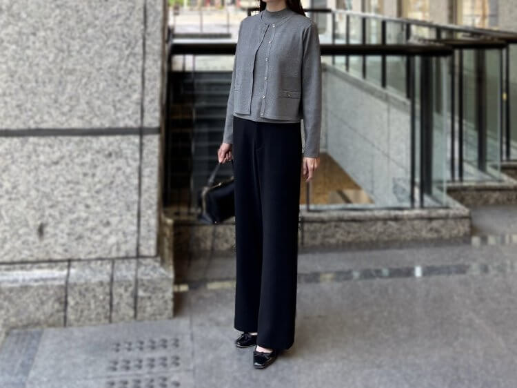 クリーンで上品な印象を与えるグレーのアンサンブルを主役に、ブラックのワイドパンツを合わせたシックなスタイル。