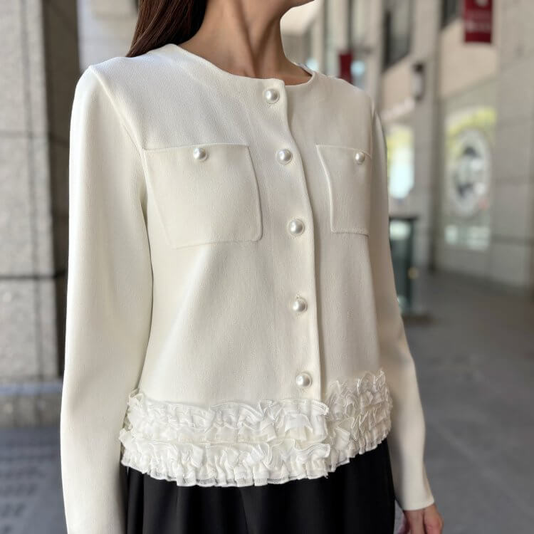 羽織りには五分袖ニットカーディガンを合わせて、パフスリーブがエレガントな印象になり、コンパクトな丈感がワンピースとバランス良くお召しいただけます。