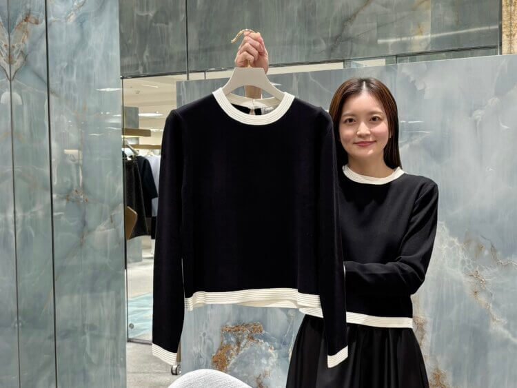 襟ぐりと袖口のバイカラーデザインが、シンプルな中に上品なアクセントを添えるニットプルオーバー。