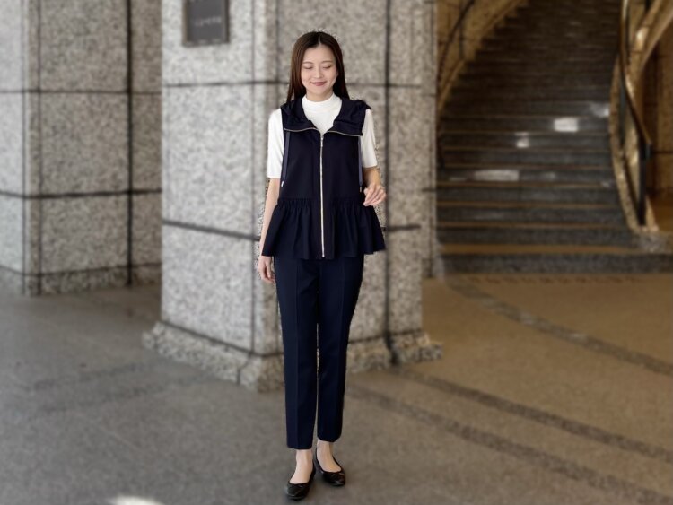 軽やかなホワイトのインナーに、ジップアップペプラムフーディジレを重ねることで、清潔感と立体的なシルエットを両立。