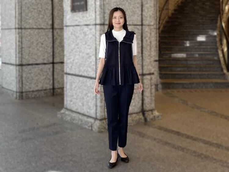 ネイビーで統一することで、落ち着きと品格を備えながらも、軽やかさのある洗練された着こなしに。