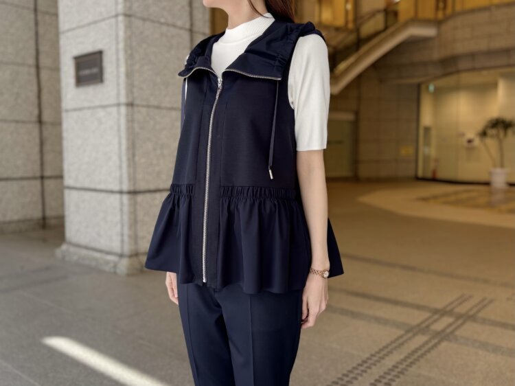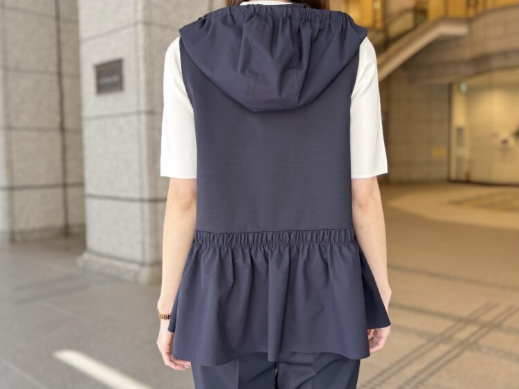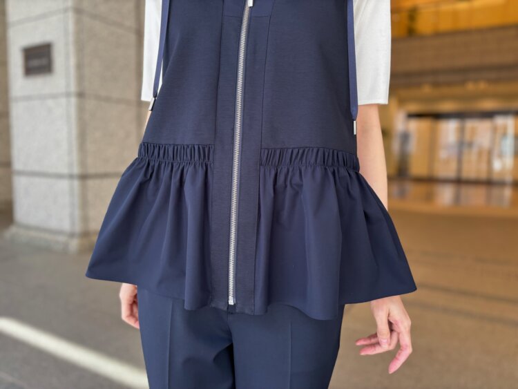 すっきりとした身頃から広がるペプラムが自然なメリハリを生み、動くたびに上品な華やぎを添えてくれます。
