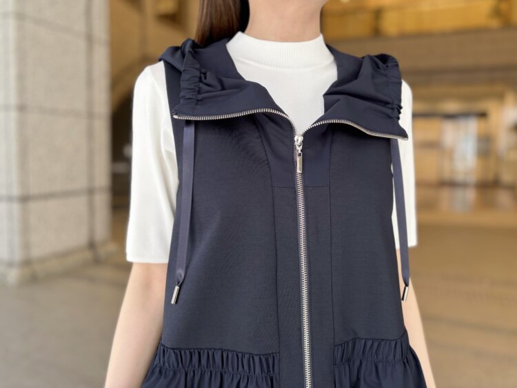 フードデザインやジップのディテールが程よく抜け感のある大人のモードスタイルを演出。