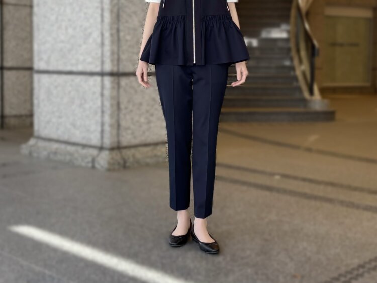 センタープレスが美しいシルエットを際立たせ、フラットシューズでもすっきりとした印象をキープしてくれます。