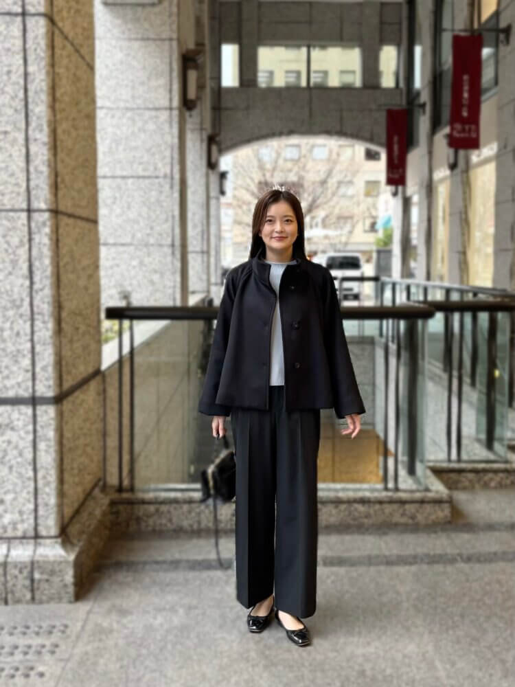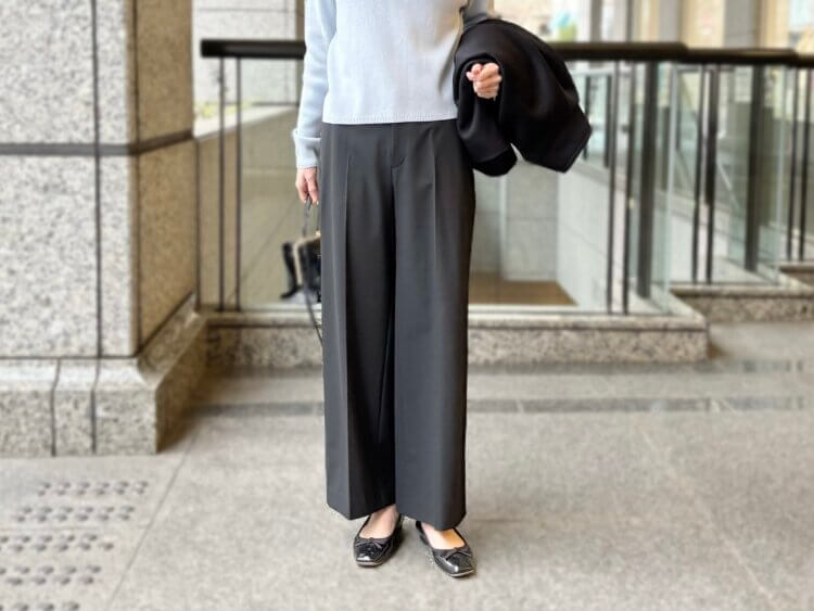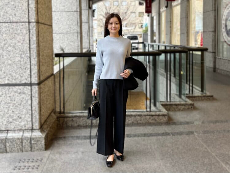 インナーには、顔映りを明るく見せてくれるサックスブルーのニットを合わせ、アウターとパンツはブラックで統一。