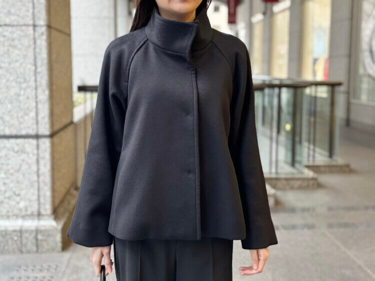 カシミヤ混ライトリバーハイネックショートコートは、首元まで包み込むデザインで、冷たい風からもしっかりガード。