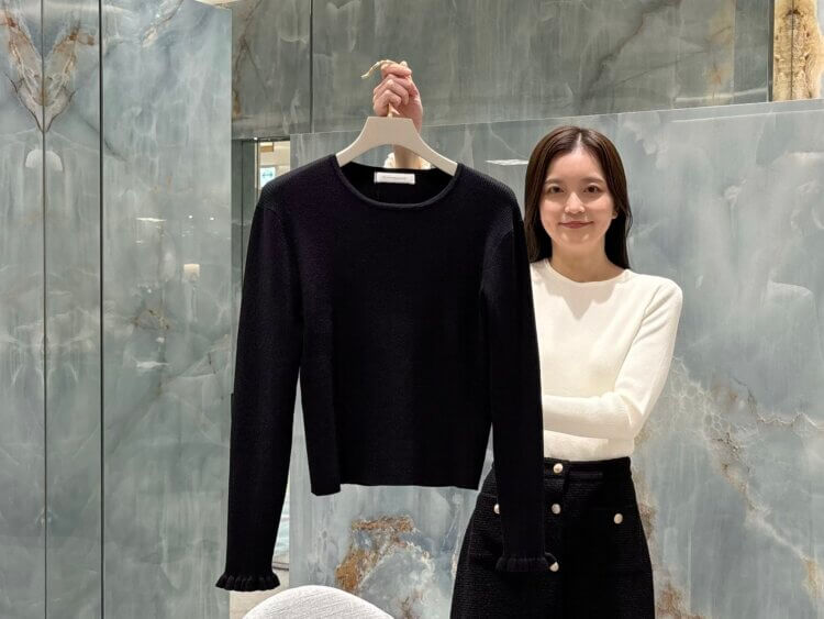 スカートにもパンツにも合わせやすく、袖口のフリルがコーディネートのアクセントに。