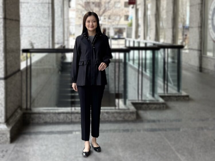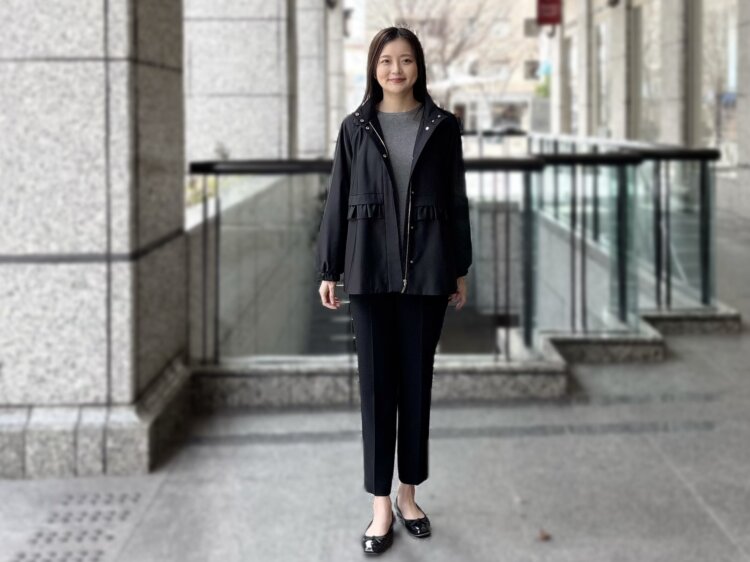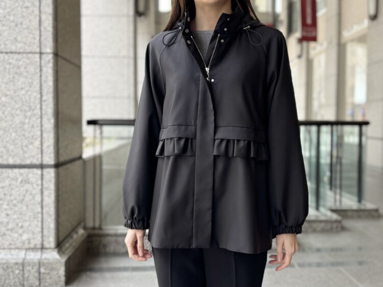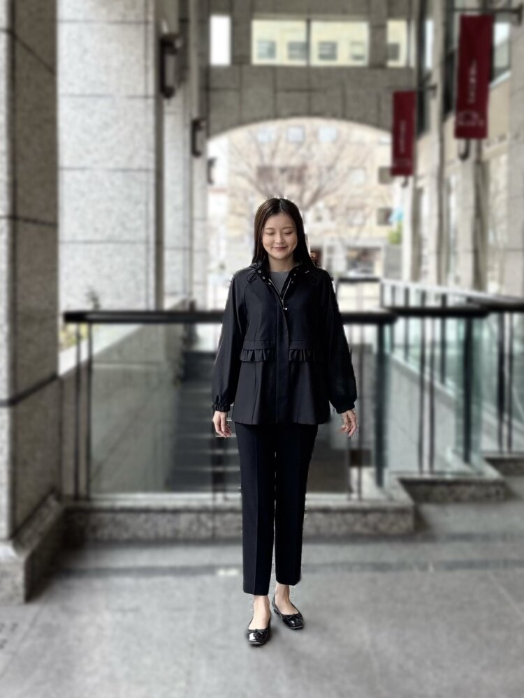 フリルディテールが印象的な2WAYパーカーを主役に、きれいめとカジュアルをバランスよく取り入れたブラックコーディネートをご紹介します。