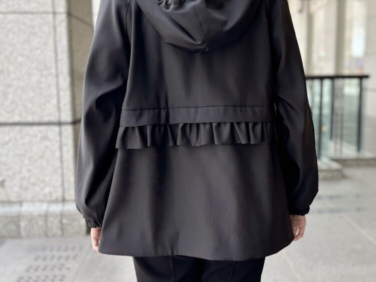 フリルで魅せる、品よく決まるブラックパーカーコーデ
