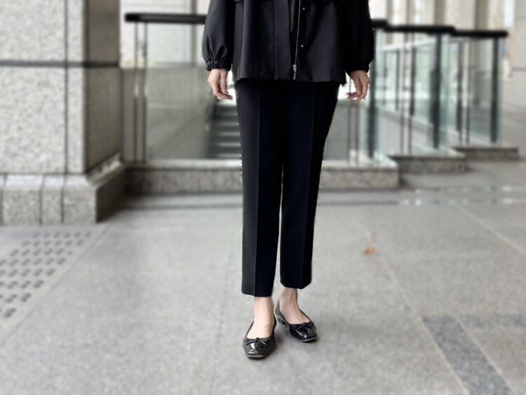 ボトムにはダブルクロス素材のセンタープレステーパードパンツを合わせ、全体をすっきりと引き締めることで、大人の品格を感じるスタイリングに仕上げました。