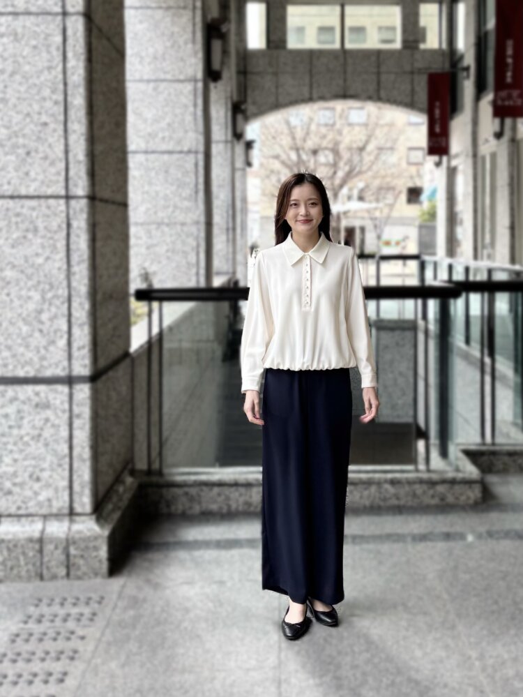 トップスはやわらかなオフホワイト、パンツはネイビーを合わせて王道配色ながらも洗練された印象にまとめました。