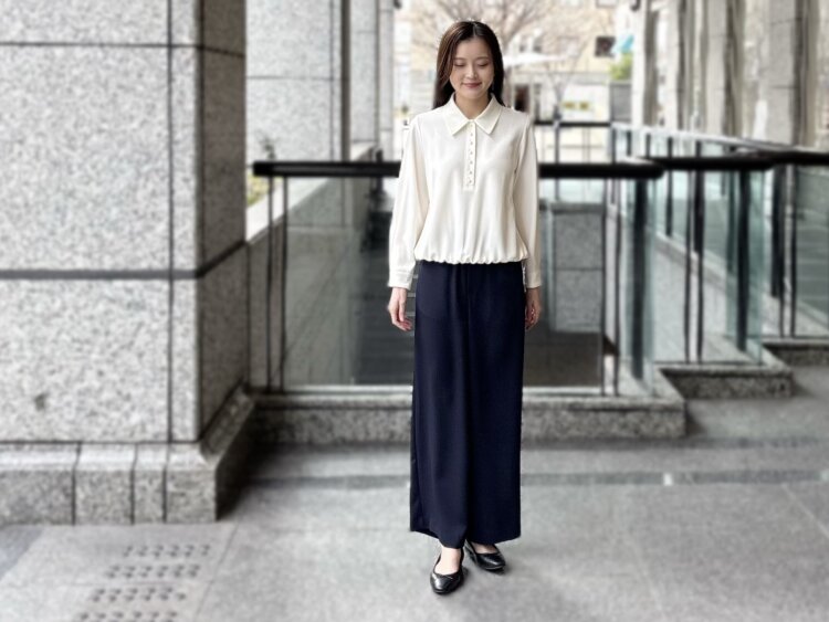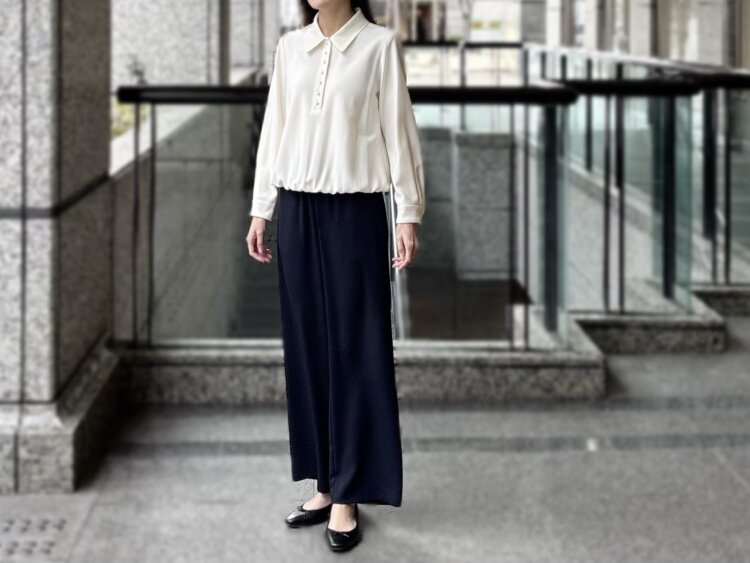 オフホワイトのブラウスにネイビーのワイドパンツを合わせた、上品さとリラックス感を兼ね備えたコーディネート。