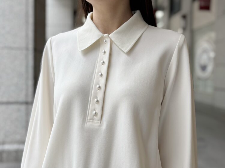 パール調ボタンが顔まわりにさりげない華やぎを添え、きちんと感がありながらも堅くなりすぎないのが魅力です。