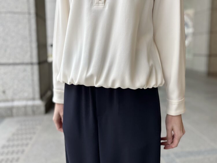トップスには、ポロデザインをエレガントに落とし込んだダブルクロスポロブラウスをセレクトしました。
