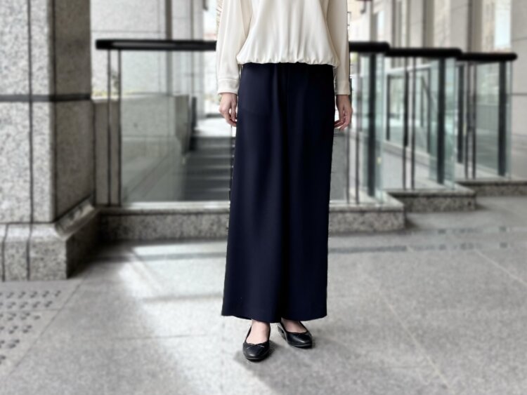 ボトムには、ダブルクロスプルオンワイドパンツをネイビーで合わせ、全体をすっきりと引き締めました。