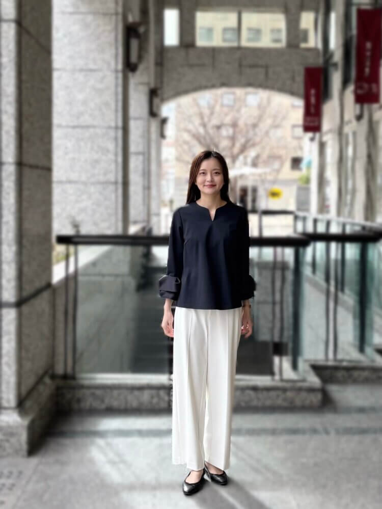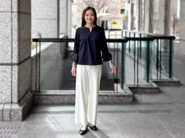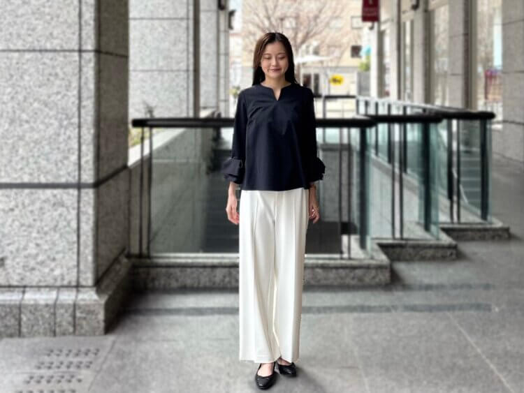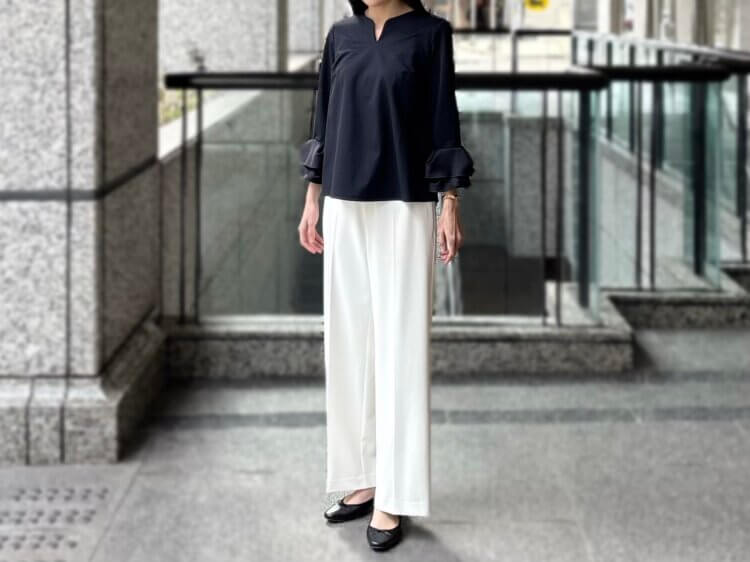 今回のスタイリングは、袖に施された立体的なディテールが目を惹くトップスに、清潔感あふれるホワイトのワイドパンツを合わせた、大人のきれいめスタイル。