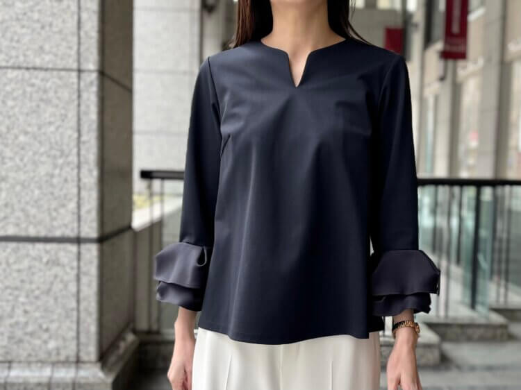 身頃はあえて装飾を抑えたミニマルなデザインにすることで、袖の華やぎがより引き立ち、大人のエレガンスを感じられる一枚に。