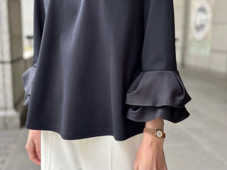 トップスに選んだティアードカフスポンチカットソーは、手元にあしらわれたティアードデザインがポイント。