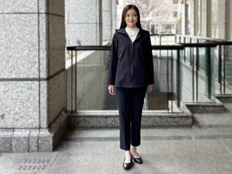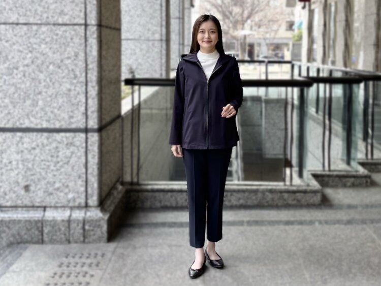 スポーティーな印象のパーカーも、ネイビーの落ち着いたカラーと上品な質感によって大人らしく仕上がり、通勤スタイルとしても取り入れやすいバランスに。